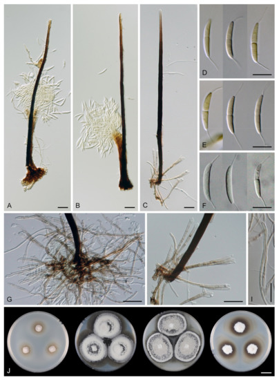 Arcuatospora seorsa. (A–C) setae with synnemata (D–F) conidia (G,H) base of the seta with conidiophores (I) conidiophore (J) colonies on CMD, MLA, OA and PCA after 4 weeks (from left to right). Images: (A,B,D,E,J) CBS 147510 ex-type; (C,F–I) CBS 147509; (A,B,D,E) from nature; (C,F–I) on PCA after 4 weeks. Scale bars: (A–C,G–I) 20 μm; (D–F) 10 μm; (J) 1 cm.