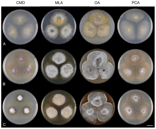 Characteristics in culture: On CMD colonies 55–60 mm diameter, circular, convex, margin entire, lanose, mucoid towards the margin, white, brown at the margin, reverse dark brown. On MLA colonies 50–56 mm diameter, circular, raised, margin entire, lanose, somewhat funiculose at the centre, furrowed, white to mouse grey, dark grey to nearly black towards the periphery, reverse dark grey to black. On OA colonies 60–62 mm diameter, circular, flat to slightly raised, lanose, floccose, funiculose, with zones of sparse growth, white to olivaceous grey, dark olivaceous grey towards the periphery, reverse dark olivaceous grey. On PCA colonies 68–70 mm diameter, circular, convex, margin entire, lanose, funiculose centrally, white-grey, dark brown towards the margin, reverse dark brown. Sporulation was sparse on PCA after prolonged incubation (>8 weeks), absent on CMD, MLA, and OA.