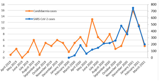 Temporal evolution of candidaemia cases (left axis) and SARS-CoV-2 cases (right axis).