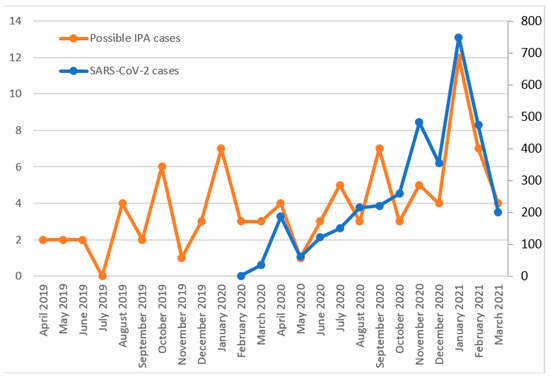 Possible IPA cases (left axis) and SARS-CoV-2 cases (right axis).