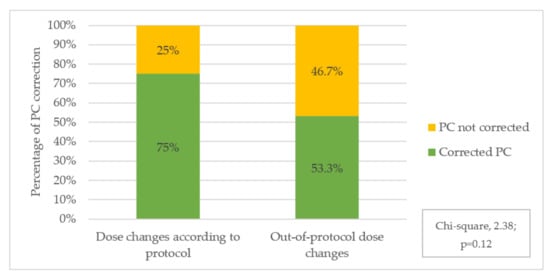 Almost two-thirds of inadequate plasma voriconazole values in the present study were corrected with dose changes. However, sometimes the protocol recommendations were not strictly followed. In some instances, we found no clinical justification for non-compliance, but in most cases the PC values were very close to the therapeutic interval and the attending physician decided to make a smaller dose change than was recommended. Although a statistically significant difference was not obtained, the percentage of PC correction was higher when the study recommendations were strictly followed (Figure 1). Other studies have reported a correction rate of around 60% to 80%, but none of them have described a predefined scheme for dose adjustment [30,33,41]. Predefined recommendations for adjusting voriconazole dose following monitoring may favour early correction of voriconazole levels and should be standardized.