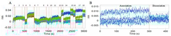 The two proteins, BmTEME214 and BmSEC23, were expressed by Escherichia coli with His-tag and purified by nickel affinity chromatography [17]. The affinity analysis was performed on a ForteBio OctetQK System (K2, Pall Fortebio Corp, Menlo Park, CA, USA). The protein samples were coupled with a biosensor for immobilization. Serial dilutions (7.81, 15.62, 31.25, 62.5, and 125 µmol/L) of DA were used for treatments. PBST buffer (0.05% Tween20, 5% DMSO) was used for the running and dilution buffer. The working procedure was baseline for 60 s, association for 60 s, and dissociation for 60 s. Finally, the data analysis software (9.0, Pall Fortebio Corp, Menlo Park, CA, USA) was used to evaluate the affinity constants.