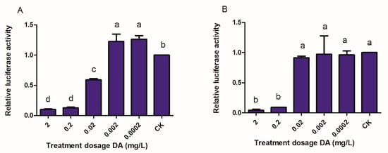 The results showed that DA considerably influences the interactions of BmTMEM214–BmSEC13L and BmSEC23–BmSEC13 (Figure 3). For the BmTMEM214–BmSEC13L interaction, DA at higher dose (0.02 µg/mL) inhibited the interaction, while at lower doses (0.002–0.0002 µg/mL), it activated the same interaction, because the activities of luciferase decreased by ~40%andincreased by ~20% were found in higher dose and lower dose DA treatments, respectively (Figure 3A). However, a DA dose-dependent relative luminescent value decrease was recorded in BmSEC23–BmSEC13, where only at the dose ≥0.2 µg/mL did DA significantly inhibit the interaction between the proteins (Figure 3B).