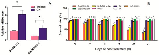 The effect of gene silencing on DA toxicity against the silkworm in RNAi tests. (A) The relative expression of BmSEC13 and BmTMEM214 in the silkworm after feeding dsRNA. (B) The mortality of the silkworm after treatments with DA 1.5 µg/g body, dsBmSEC23, and dsBmTMEM214 40 µg/g body. DMSO: DMSO injection only. CK: normal feeding without any treatment. The star (*) in (A) indicates the significant difference (p < 0.05) by t-test. The letters on the column in (B) indicate the significant difference (p < 0.05) by Tukey’s HSD.