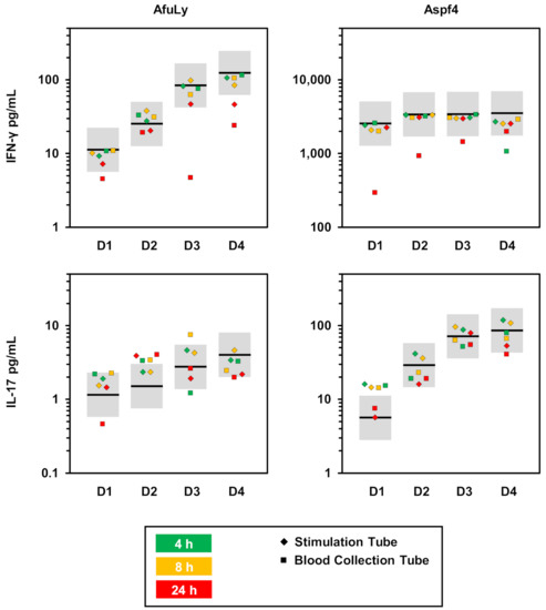 Robustness of WB-ELISA to pre-analytic delays. WB samples from 4 highly mold-exposed healthy donors were stimulated for 24 h with AfuLy or Aspf4 using RPMI-supplemented, α-CD28-, and α-CD49d-containing stimulation tubes, as described in the Materials and Methods Section. IFN-γ and IL-17 concentrations in plasma supernatants were quantified by ELISA. WB was injected and incubated at 37 °C either immediately (black bars) or after pre-analytic storage at room temperature for 4 (green squares), 8 (yellow squares), or 24 h (red squares). In addition, immediately injected stimulation tubes were kept at room temperature for 4 (green diamonds), 8 (yellow diamonds), or 24 h (red diamonds) prior to being transferred to 37 °C for another 24 h incubation period. Individual background-corrected cytokine concentrations for each condition are shown. Grey boxes indicate a ±2-fold change compared with the immediately incubated control sample. Abbreviations: AfuLy = A. fumigatus mycelial lysate, WB = whole blood.