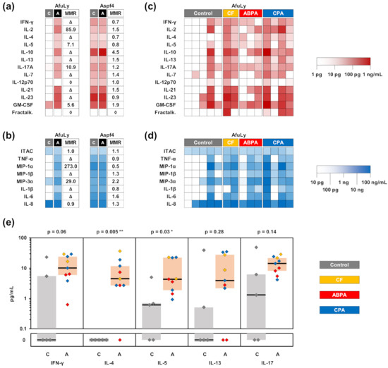 Comparison of Aspergillus-induced cytokine release in patients with Aspergillus-associated lung pathologies and other chronic lung diseases. WB from 9 patients with Aspergillus-associated lung pathologies (2 CF with A. fumigatus sensitization, 3 ABPA, and 4 CPA) and a control group of 5 patients with other chronic lung diseases was stimulated with AfuLy or Aspf4 using the RPMI-supplemented, α-CD28-, and α-CD49d-containing stimulation tubes, as described in the Materials and Methods Section. Cytokine concentrations in plasma supernatants were quantified using a 21-plex Luminex assay. (a,b) Heat maps indicating median background-adjusted cytokine concentrations in the ABPA/CF/CPA patient cohort “A” and control cohort “C” depending on the antigen used for stimulation. The numeric value in the MMR column represents the median-to-median ratio between the two cohorts, with values > 1.0 indicating greater median cytokine concentrations in the ABPA/CF/CPA cohort. Δ denotes infinite median-to-median ratios (median = 0 pg/mL in the control cohort). ◊ denotes undefined median-to-median ratios (median = 0 pg/mL in both cohorts). (c,d) Heat maps summarizing individual cytokine response to AfuLy in all 14 patients. (e) Comparison of individual AfuLy-induced concentrations of selected T-helper cell signature cytokines. Medians and interquartile ranges for patients with ABPA/CF/CPA (“A”, red) and controls (“C”, grey) are indicated by black bars and colored boxes, respectively. Two-sided Mann–Whitney U test. Abbreviations: AfuLy = A. fumigatus mycelial lysate, ABPA = allergic bronchopulmonary aspergillosis, CF = cystic fibrosis, CPA = chronic pulmonary aspergillosis, Fractalk. = fractalkine, WB = whole blood.