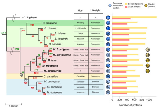 The future for brown rot control and marketing entails an additional effort to understand the fruit-pathogen interaction to develop new control strategies. The availability of genomes for the main Monilinia spp. on stone fruit [22,23,24] coupled with a comparative genome analysis can be useful to elucidate common and different genomic features among organisms, identifying key genes responsible for the host-specificity of each Monilinia species. It can also explain the differential ecological fitness of each Monilinia spp. in various environments and their rate of spread in different geographical areas. For these reasons, this study outlines and compares genome sequences for European strains of Monilinia spp. to conduct a phylome analysis. Furthermore, a comparison was performed among Monilinia spp. of several functionally annotated features such as CAZymes, effector proteins, secondary metabolism (SM) gene clusters, the mating locus, and genes involved in pathogenicity.