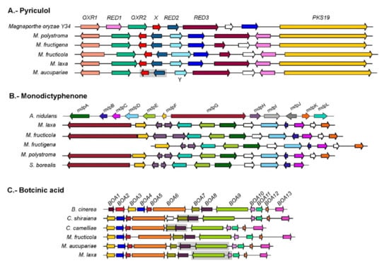 Secreted proteins that were specific to Monilinia species and present in all five species included a glucose-methanol-choline oxidoreductase and two proteins annotated as Berberine-like. These last proteins could be homologous to proteins found in the Pyriculol cluster of Magnaporthe oryzae [57]. Pyriculol and its derivatives produce leaf lesions, although the deletion of this cluster in M. oryzae did not affect virulence in rice [57]. A homolog of this cluster is present in all five Monilinia species (see Figure 2A and Table S4). One of the proteins in the cluster, shown in Figure 2A marked with an X, was not thought to be involved in the synthesis of pyriculol in the original description of the cluster [57] but is conserved across the Monilinia species. The presence of an additional dehydrogenase (Y in Figure 2A) and the conservation of gene X could indicate that the compound synthesized by the Monilinia cluster is not Pyriculol but a related compound. Sassa et al. [58] described the presence in M. fructicola of monilidiol, a compound with antibiotic and phytotoxic activity similar to pyriculol. It is possible that the compound synthesized by this cluster is monilidiol [58]. Alternatively, the PKS encoded in this cluster matches a fragment sequenced that is thought to be responsible for synthesis of the antibiotic and antifungal chloromonilicin [59]. Further research is necessary to establish whether this cluster is responsible for the synthesis of monolidiol, chloromonicilin, or an alternative compound.