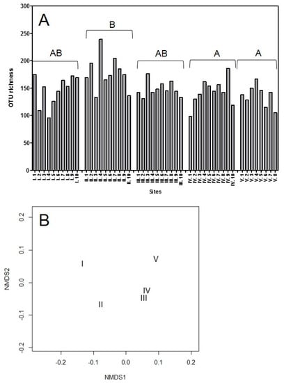 Figure 1. OTU richness determined by direct amplicon sequencing of roots from five sites and community composition. (A) Variation in OTU richness across five sites at individual plant level. Capital letters show differences in mean number of OTUs identified per site. Different capital letters represent significant differences; sites sharing the same letter are not significantly different (p ≤ 0.05). Created in GraphPad Prism 5. (B) Comparison of the community composition between the five sites using non-metric multidimensional scaling, stress was <0.05. Created in R version 3.4.3.
