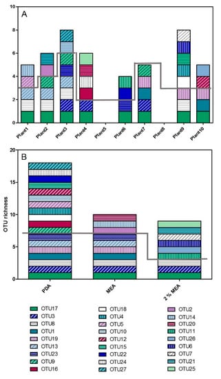 Figure 3. OTU richness cultured from individual plants in site III and media influence on OTU richness. Each colour pattern represents a different OTU and their taxonomic identification can be found in Table 3. (A) OTUs isolated from individual plants. The OTUs below the grey line can all be found in more than one plant and the OTUs above the grey line are unique to the specific plant. No endophytes were cultured from plant 5 and no ITS sequence was amplified from the cultures isolated from plant 8. (B) OTU richness isolated on three types of media. The OTUs below the grey line can all be isolated on PDA whereas the OTUs above the grey line were only isolated on a specific medium. Created in GraphPad Prism 5.