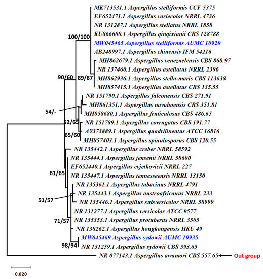 Figure 2. Phylogenetic tree generated from MP analysis based on ITS sequence data of Aspergillus stelliformis AUMC 10920 and A. sydowii AUMC 10935 associated to other related genes in Aspergillaceae. Blue color refers to the species in this study. Bootstrap support values (100 replications) for ML/MP combination equal to or greater than 50% are indicated at the respective nodes. The tree is rooted to Aspergillus awamori-CBS 557.65 as the out group.
