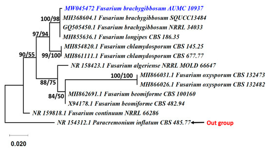 Figure 3. Phylogenetic tree generated from MP analysis based on ITS sequence data of F. brachygibbosum AUMC 10937 associated to other related genes in Nectriaceae. Blue color refers to the species in this study. Bootstrap support values (100 replications) for ML/MP combination equal to or greater than 50% are indicated at the respective nodes. The tree is rooted to Paracremonium inflatum CBS 485.77 as the out group.