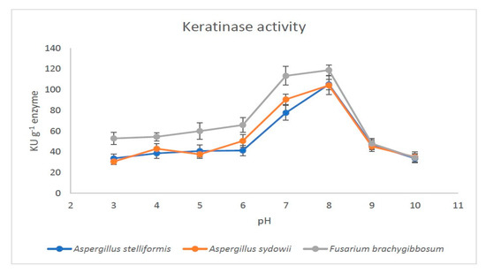 In submerged fermentation, the three fungi produced keratinases with relatively high yield. It was possible to produce 4.0 g keratinase powder from A. stelliformis, 4.5 g from A. sydowii, and 3.7 g from F. brachygibbosum per liter of fermentation medium. The keratinases appeared to be active; the highest activity was reached at pH 8.0 for each microbial keratinase, and were 105, 104, and 119 KU/g keratinase for A. stelliformis, A. sydowii, and F. brachygibbosum, respectively (Figure 4). The specific activities were 4223, 3522, and 3277 IU/mg protein, respectively.