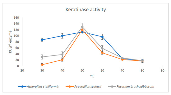 The optimum temperature was 50 °C (pH 8.0) for each of the three microbial keratinases. The activity values increased to 113, 120, and 130 KU/g keratinase produced by A. stelliformis, A. sydowii, and F. brachygibbosum, respectively (Figure 5). A notable observation was that F. brachygibbosum was active at a wide temperature range (30–60 °C). The optimum temperature (50 °C) also increased the specific activity of the three keratinases to 4521, 4060, and 3573 IU/mg protein for A. stelliformis, A. sydowii, and F. brachygibbosum, respectively.