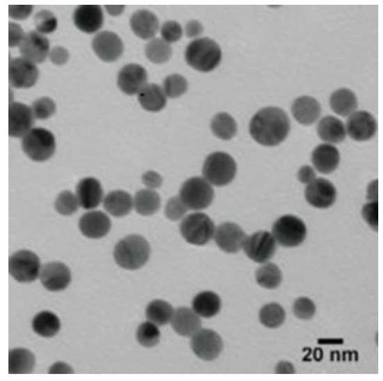 The TEM was used to detect the size and shape of the AgNPs. According to the TEM micrographs, the recorded diameter of the AgNPs was 20 nm (±5 nm), and they were spherical in shape (Figure 2).