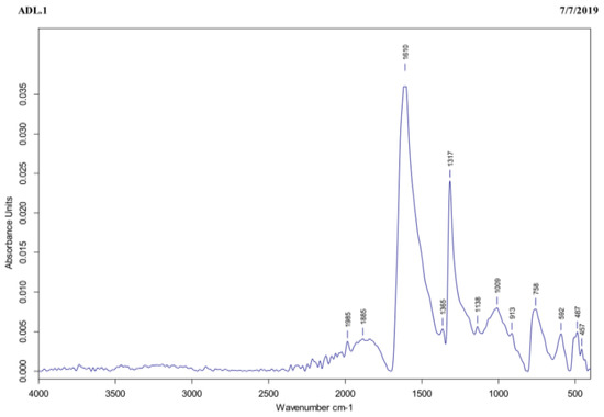 According to [18], FTIR measurements were carried out on the AgNPs to identify the possible presence of bioactive molecules in the crude tea extract that were responsible for reducing the silver ions. The spectrum was recorded using three replicates through a wavelength interval of 400–450 cm−1 using a resolution of 4 cm−1. Molecular analysis of the AgNPs sample was carried out using an FTIR spectroscopy Perkin-Elmer-1600 (Waltham, MA, USA).