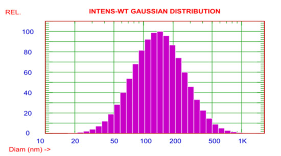 To confirm the size of AgNPs, the DLS assay was manipulated. The observed size of these AgNPs ranged from 20–1000 nm. However, the average particle size was about 170.6 nm (Figure 4). The zeta potential of the AgNPs was observed as a sharp peak at −20.06 mV detected by the electrophoretic mobility.