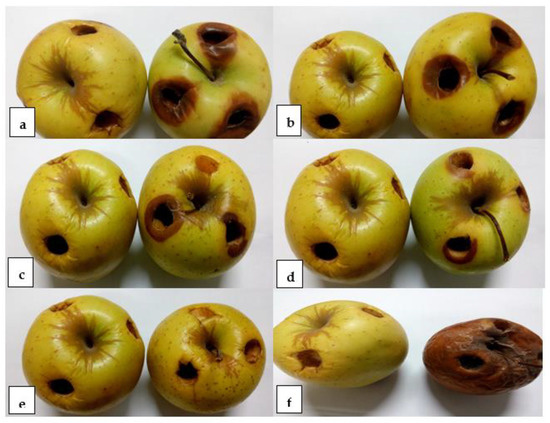 2.7. In Vivo Control of M. fructigena on the Apple Fruits