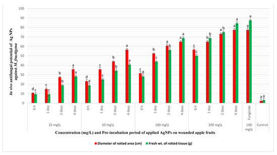 In vivo antifungal potency of different concentrations (25–200 mg/L) and different pre-incubation periods (0 h–4 days) of AgNPs coinoculated with M. fructigena (2 × 106 CFU/mL) in wounded apple fruits, and then incubated at 28 °C for 10 days. An appreciable reduction in the percentages (%) of the rot symptoms was recorded, evaluated through reduction in percentages of diameters and fresh weights of the fruits rotting lesions. This inhibitory activity was dose and time dependent, compared to the positive control fruits treated with the synthetic fungicide (100 mg/L) and the nontreated control fruits. Results are means of six replicate fruits of the most accurate assay. Columns with different superscript letters indicate significant differences (p ≤ 0.05) based on one-way ANOVA analysis. The error bars represent the ± standard deviations.