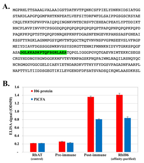 The established ELISA protocol [3] was modified to assess the rabbit anti-I06 protein antibody level. In brief, a 96-well polystyrene plate (Corning, NY, USA) was coated with either the synthesized I06 protein (0.1 µg/well) or PiCFA (5 µg/well) at 4 °C overnight. After washing the unbound proteins 4 times, each well was blocked using PBS with 0.5% bovine serum albumin (250 µL/well) at 37 °C for 60 min. Following another washing step, the RbI06, pre-immunized, and post-immunized sera (each diluted at 1:1000 in PBST-azide (137 mM NaCl, 2.7 mM KCl, 10 mM Na2HPO4, 1.8 mM KH2PO4, 0.1% Tween−20, 0.1% Sodium azide)) were added to wells, incubated at 37 °C for 60 min. A rabbit anti-human alpha-tubulin serum (Serum ID: RbAT; Santa Cruz Biotechnology, Dallas, TX, USA) (1:1000 in PBST-azide) was included as a negative control. After washing, the peroxidase-conjugated protein A/G (Bio-Rad, Hercules, CA, USA; 1:100,000 in PBST with 1% bovine serum albumin; 100 µL/well) was added and incubated at 37 °C for 60 min. The plate was washed once again. The 3,3′,5,5′-tetramethylbenzidine and H2O2 (Thermo Scientific, Waltham, MA, USA) were the in-use chromogenic substrate (100 µL/well). Sulfuric acid (0.5 N; 100 µL/well) stopped the ELISA reaction. An ELISA signal (optical density at the 450 nm wavelength; OD450) was measured. All serum samples were tested in duplicate.