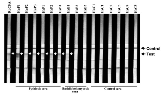 ICT testing against the serum panel. The panel sera are from 3 humans (HuP1–3) and 3 horses (HsP1–3) with pythiosis, 5 horses with another infection caused by B. ranarum (HsB1–3), Aspergillus flavus (HsC4), and Actinomyces species (HsC5), 4 healthy individuals (HuC1, HsC1–3), and 1 P. insidiosum CFA-immunized rabbit (RbCFA). Black arrows indicate the control and test lines of the ICT assay. White arrows show the generated test line of each ICT-positive serum sample.