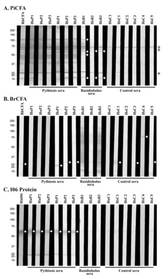 3.3. Western Blot Analyses Reveal Cross-Reactive Antigens of P. insidiosum