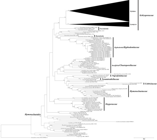The combined dataset of ITS, nLSU and mt-SSU regions (2) including 380 collections resulted in a concatenated alignment of 3425 characters with GTR+I+G as the best-fit evolutionary model. The ML search stopped after 250 BS replicates. In BI, all chains converged after 50 million generations with an average standard deviation of split frequencies of 0.003928, which was indicated by the ESSs above 2690 and the PSRFs close to 1000. ML and BI algorithms generated similar topologies in main lineages, and thus only the topology generated by the ML algorithm is presented along with BS value and BPPs above 50% and 0.8, respectively, at the nodes (Figure 2). The phylogeny generated by this dataset strongly supports Hymenochaetales as an independent order (BS = 98%, BPP = 1). Within Hymenochaetales, five other families, viz. Coltriciaceae, Hymenochaetaceae, Neoantrodiellaceae, Nigrofomitaceae and Oxyporaceae are strongly (BS = 100%, BPP = 1) or moderately (BS > 58%, BPP > 0.99) supported as five monophyletic lineages, while the six genera belonging to Hyphodontia sensu lato are all strongly supported as independent genera. Of the six genera, Fasciodontia, Lyomyces and Xylodon form a strongly supported clade (BS = 96%, BPP = 1), while Hyphodontia, Kneiffiella and Hastodontia represent independent lineages within Hymenochaetales. As Schizopora, the type genus of Schizoporaceae, is a later synonym of Xylodon, the clade including Fasciodontia, Lyomyces and Xylodon, recognized at the family level, should be called Schizoporaceae. Similarly, Chaetoporellus is a later synonym of Kneiffiella, so the family name Chaetoporellaceae typified by Chaetoporellus was reintroduced for the well supported clade of Kneiffiella (BS = 81%, BPP = 0.97). The clade of Hyphodontia (BS = 100%, BPP = 1) outside of previously arranged families Chaetoporellaceae and Schizoporaceae are described as one new family on the basis of this genus. Hastodontia is considered to be a genus with an uncertain taxonomic position at the family rank within Hymenochaetales, because at the moment it includes two species that were separated in the current phylogenies (Figure 1 and Figure 2). The 14 novel species-level lineages each with at least two specimens identified by the ITS-based phylogeny (Figure 1) also formed in the same genera in this combined dataset. They are described as 14 new species also taking morphological characters into consideration.