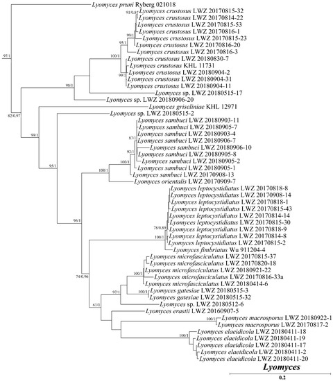 Phylogenetic relationship among species of Lyomyces inferred from the combined dataset of ITS, nLSU, mt-SSU, tef1α, rpb1, rpb2 and atp6 regions. The topology generated by the maximum likelihood algorithm is presented along with the bootstrap values and the Bayesian posterior probabilities above 50% and 0.8, respectively, at the nodes.