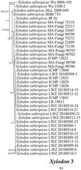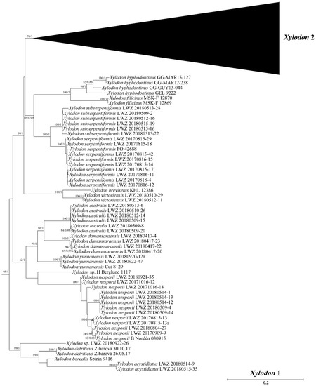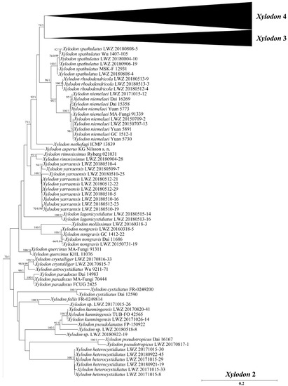 - Chen, C.C.; Wu, S.H.; Chen, C.Y. Xylodon subflaviporus sp. nov. (Hymenochaetales, Basidiomycota) from East Asia. Mycoscience 2018, 59, 343–353. [Google Scholar] [CrossRef]