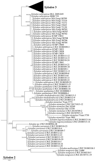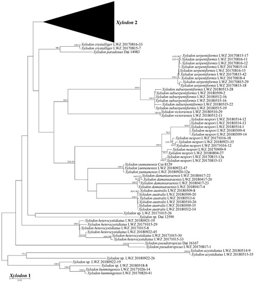 At the generic level, after a series of phylogenetic studies, six genera, viz. Fasciodontia, Hastodontia, Hyphodontia, Lyomyces, Kneiffiella and Xylodon were eventually accepted to accommodate the members of Hyphodontia sensu lato [13,16,17,18,35,40,44]. However, their generic delimitations did not all receive strong support from phylogenies based on ITS and/or nLSU [16,17,18,40,44].