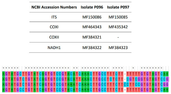 Accession numbers of the sequences of Pythium kashmirense deposited in NCBI (Above); Sequence comparison of the ITS region of Pythium kashmirense (P096), Py. rostratifingens (P216), Py. sylvaticum (P194) and Py. dissotocum (P107), from top to bottom, sequence fragment from 496 to 554 bp (below). * indicates no variation in the nucleotide at that single position.