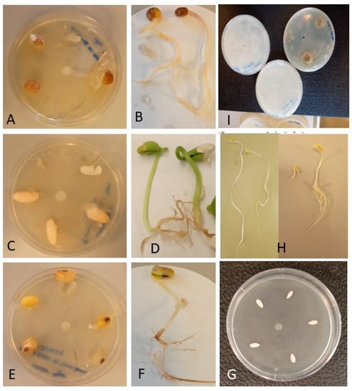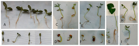 Pathogenicity indices of four plant species inoculated with Py. kashmirense. In vivo assay. (A) Cucumber-control, (B) Cucumber-inoculated, (C) Blue lupin-control, (D) Blue lupin-inoculated, (E) Soya bean-control, (F) Soya bean-inoculated, (G) Common bean-control, (H,I) Common bean-inoculated.