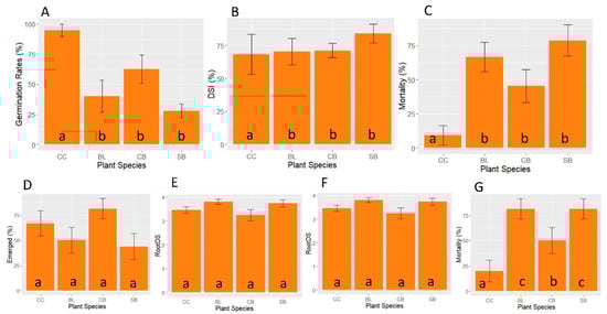 Pathogenicity indices of four plant species inoculated with Py. kashmirense. In vitro inoculation of cucumber (CC) blue lupin (BL), common bean (CB) and soya bean (SB) with Py. kashmirense (A) Germination rate, (B) Disease Severity Index (DSI) and (C) Mortality. In vivo inoculation of cucumber (CC), blue lupin (BL), common bean (CB) and soya bean (SB) with Py. kashmirense; (D) Emerged rates; (E) Foliar Symptoms; (F) Root disease severity index (DSI); (G) Mortality. The letters indicate the comparisons that resulted as significant after the statistical analyses tests.