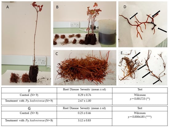 In the in vitro assay, the mean root disease severity was 2.67 for the Py. kashmirense-inoculated treatment, compared with 0.23 in controls. Similar results were obtained in the in vivo assay (Mean RDS: 3.13 inoculated; 0.25 control). A Wilcoxon test showed that differences between inoculated roots and controls were significant (p = 0.002 and p < 0.001) for in vitro and in vivo assays, respectively) (Figure 6).