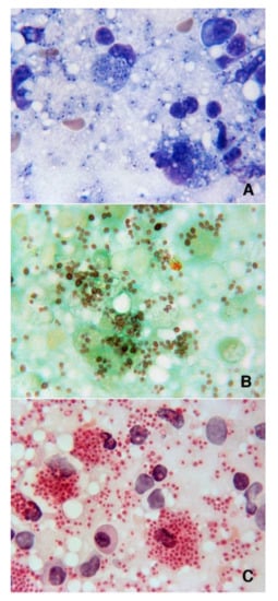 Imprint touch preparations from latero-cervical lymph node biopsies stained with Giemsa (A), Grocott (B), and PAS (C), showing intracytoplasmic capsulated microorganisms morphologically consistent with Histoplasma spp. (magnification 1000×).