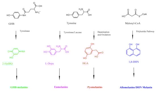 A simplified diagram showing the precursors for the three different kinds of fungal melanin. GHB-melanins (far left, green) are synthesized through a series of reactions with tyrosinase. Eumelanins (center left, pink) are synthesized via the L-Dopa pathway, which uses tyrosine as a precursor. Pyomelanins (center right, red) also use tyrosine as a precursor but are ultimately derived from HGA. Allomelanins (far right, blue) are derived from 1,8-DHN.