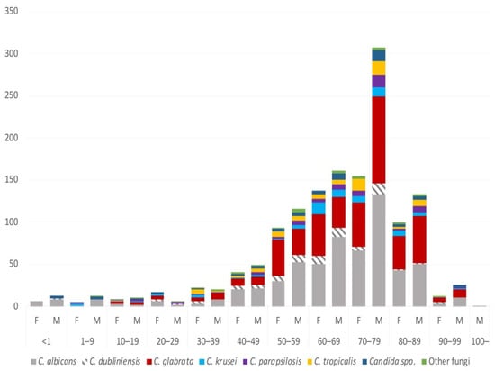 A total of 1454 unique blood isolates from 1402 unique episodes in 1311 patients were collected in the years 2016 to 2018 (Table 1). Half of the candidaemia cases (52.8%) involved patients 60–79 years old (Supplementary Table S2). Most episodes occurred in males (60%) (Table 1). The age and gender group that contained the highest number of isolates (21.1%) was males 70–79 years old (Figure 1).