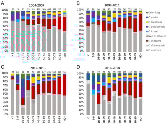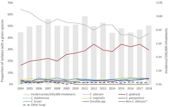 During 2004–2018 C. albicans decreased (64.4% to 43.7%) and C. glabrata increased (16.5% to 29.7%) [], (both p < 0.0001 compared with 2004–2007, 2008–2011, 2012 –2015, and 2016–2018). Moreover, C. dubliniensis and other Candida species increased (p < 0.001 and p = 0.004, respectively), whereas the proportions of C. krusei, C. parapsilosis, and C. tropicalis remained stable (Figure 2).