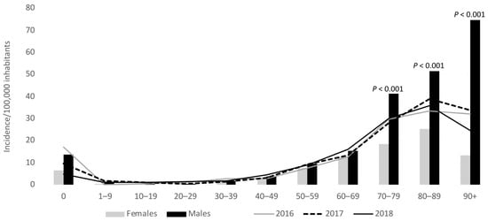The incidence rate was significantly higher in the older age groups for both males (80–89 and ≥90 years) and for females (80–89 years) compared to all other age groups (Figure 3, Supplementary Table S3).