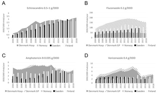 Annual consumption of selected antifungal compounds ((A) Echinocandins, (B) Fluconazole, (C) Amphotericin B, (D) voriconazole) shown in DDDs per 1000 inhabitants per year in 2004 to 2018. For Denmark the usage is divided into hospital use (Hosp) and general practitioner use (GP). Data from 2004 to 2015 were also shown in the surveillance by Astvad et al. [].