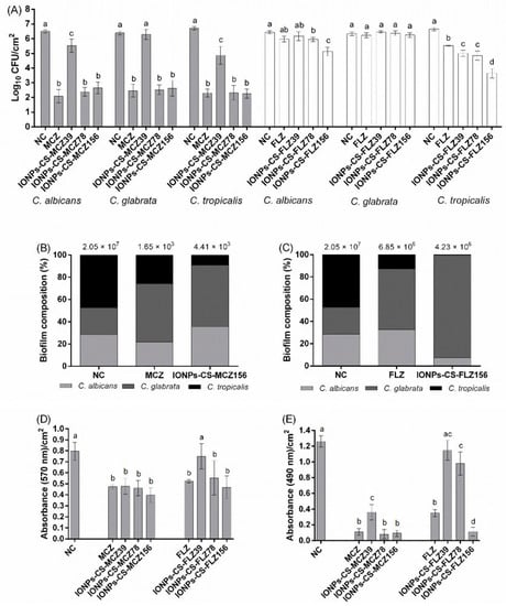 MCZ, IONPs-CS-MCZ78, and IONPs-CS-MCZ156 did not differ from one another and achieved the greatest reductions (3.77- to 4.46-log10; p < 0.001) in CFU numbers of C. albicans, C. glabrata, and C. tropicalis compared to NC (Figure 1A). Although IONPs-CS-MCZ39 led to significant decreases in CFUs of C. albicans and C. tropicalis compared to NC, this nanocarrier was not able to overcome the reductions promoted by MCZ alone (Figure 1A).