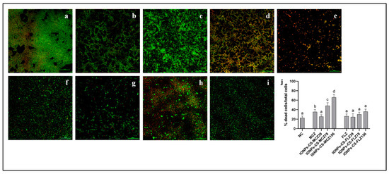 Confocal laser scanning microscopy images of 48 h mixed biofilms of Candida albicans, Candida glabrata, and Candida tropicalis treated (24 h) with miconazole (MCZ) at 156 µg/mL (b), chitosan (CS)-coated iron oxide nanoparticles (IONPs) carrying MCZ at 39 (c), 78 (d), and 156 µg/mL (e), fluconazole (FLZ) at 156 µg/mL (f), and FLZ-containing nanocarrier at 39 (g), 78 (h), and 156 µg/mL (i). Biofilm grown for 72 h in artificial saliva devoid of drugs depicts the negative control (NC;a). Dead and living cells are represented by red and green fluorescence, respectively. Magnification: 20×. Bars: 100 µm. The percentages of dead cells after treatment with each compound are shown in image “j”. Distinct lowercase letters depict significant differences among the groups within each drug (one-way ANOVA and Fisher LSD’s test; p < 0.05). Statistical analysis was conducted separately for each antifungal agent, its nanocarriers, and negative control.