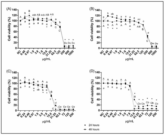 Percentages of viable L929 cells (murine fibroblasts) after exposure to fluconazole at 0.48–1000 µg/mL (A), fluconazole-containing nanocarrier at 0.48–1000 µg/mL (B), miconazole at 0.24–250 µg/mL (C), and miconazole-containing nanocarrier at 0.24–250 µg/mL (D). Fibroblasts cultivated in drug-free culture medium depict the negative control (NC). Different upper- and lower-case letters indicate significant differences among the concentrations of the compounds, respectively, for 24 and 48 h of exposure. * Represents significant difference between 24 and 48 h of exposure, within each concentration assessed (two-way ANOVA and Tukey’s test; p < 0.05).