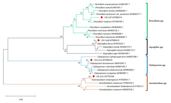 Phylogenetic tree of the isolated fungi constructed using the sequences of internal transcribed spacer regions (incl. 5.8S rDNA) (ITS). The isolated fungi were labeled as a red spot. Sequences for the ITS phylogenetic analysis were obtained from the GenBank database for the following strains: Aspergillus flavus, Aspergillus niger, Aspergillus tamarii, Aspergillus oryzae, Aureobasidium caulivorum, Aureobasidium iranianum, Aureobasidium thailandense, Aureobasidium melanogenum, Cladosporium acalyphae, Cladosporium colombiae, Cladosporium phaenocomae, Cladosporium sphaerospermum, Cladosporium tenuissimum, Penicillium araracuarense, Penicillium baarnense, Penicillium corylophilum, Penicillium commune, Penicillium hirsutum, Penicillium vavanicum var. javanicum, Penicillium levitum, Penicillium oxalicum, Penicillium wotroi. The GenBank accession number is included after the fungal scientific name. The tree was constructed using the neighbor-joining method and tested by bootstrapping with 1000 replicates of data. Percentages are reported at nodes, and the scale bar represents 0.05% sequence divergence.