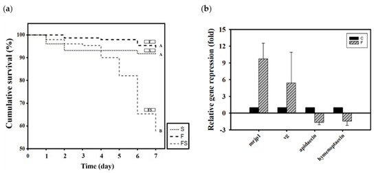 The experiment was performed on three groups of 50 newly emerged adult honey bees, which were given 50% sucrose syrup (S), SYM broth that had fermented for 4 days (F), and supernatant liquid from that fermentation broth (FS), respectively. The honey bees were placed in a transparent acrylic cage (15 cm × 10 cm × 15 cm) that were transferred to a growth chamber with no light in which the temperature and relative humidity were maintained at 33 ± 1 °C and 60% ± 10% [47]. The syrup or fermentation broth was replaced every 3 days, and the bees were observed for 1 week, during which the mortality rate was recorded and the dead bees were removed. This experiment was conducted three times using three honey bee colonies.