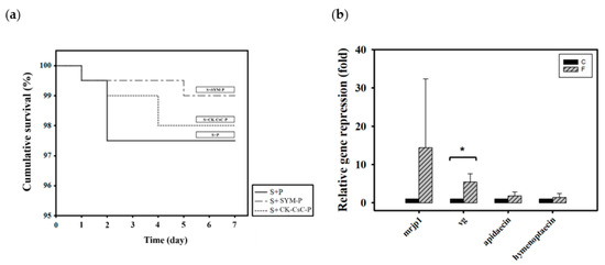 The iScript cDNA Synthesis Kit (Bio-Rad, Hercules, CA, USA) was used to reverse transcribe 1 μg of total RNA into cDNA. Next, qPCR was performed to determine the expression of nutrient genes mrjp1 and vg and antibacterial peptide genes apidaecin and hymenoptaecin. The primers used are presented in Supplementary Table S2 [23,47,48,49]. Each qPCR assay was conducted in a 96-well plate, and every 20 μL of reaction solution contained 10 μL of 2 × iQ SYBR Green Supermix (Bio-Rad, Taipei, Taiwan), 2.5 μL of 1.6 μM of each gene-specific primer, and 5 μL of diluted cDNA. After the reaction agents were added, the 96-well plate was placed inside a CFX Connect Real-Time System (Bio-Rad) and allowed to react. The reaction conditions were one cycle at 95 °C for 3 min, followed by 40 cycles at 95 °C for 10 s and at 59 °C for 30 s. For each cycle, the fluorescent reaction signals were detected, and Bio-Rad CFX Maestro software was used to collect and normalized to the reference gene rpS18 [50]. The relative gene expression data were analyzed using the 2−ΔΔCT method [51]. Each RT-qPCR assay involved at least three independent biological replicates with three technical repetitions.
