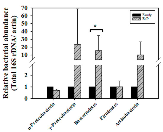Newly emerged adult bees obtain food from honeycombs, such as honey and bee bread; this contributes to gut microflora establishment [71]. In our experiment, we collected 12-h-old newly emerged bees which have obtained microflora from food stored in honeycomb, and fed these newly emerged bees syrup containing crude EPS extract for 3 days, after which we determined the counts of midgut and hindgut bacteria. No differences in total bacterial count were found between the E group and E + P group (Z = 0, p > 0.05; Supplementary Figure S4). However, the E + P group exhibited 23.5 times the amount of γ-Proteobacteria (Z = −1.0445, p > 0.05), 15.9 times the amount of Bacteroidetes (Z = 2.0889, p < 0.05), and 10.3 times the amount of Actinobacteria (Z = 0.6267, p > 0.05) bacteria of the E group. Nevertheless, only the amount of Bacteroidetes showed statistically significant difference. The amount of γ-Proteobacteria and Actinobacteria show wide variation from the four tested colonies, causing non-significant difference statistically. The counts of α-Proteobacteria (Z= −1.0445, p > 0.05) and Firmicutes (Z = −0.7178, p > 0.05) did not show difference between the E group and E + P group (Figure 4).