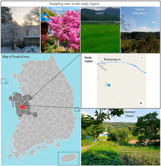 Map of sample collection sites. Samples were collected at Kunryang-ri, Cheongyang-eup, Cheongyang, Chungnam Province, Korea. Blue cursor represents the main area of Kunryang-ri for collection.