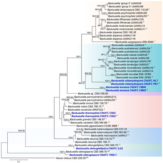 The genus Backusella (Mucoromycota, Mucorales) was established by Ellis and Hesseltine in 1969 [1] to describe Mucor-like species producing persistent-walled sporangiola on the lateral branches of their sporangiophores, which terminate in single deliquescent-walled sporangia; Backusella circina J.J. Ellis & Hesselt. is the type strain for this genus. Two years later, Pidoplichko and Milko [2] transferred Thamnidium ctenidium Durrell & M. Fleming to Backusella as B. ctenidia (Durrell & M. Fleming) Pidopl. & Milko and assigned both B. circina and B. ctenidia to the family Thamnidiaceae Fitzp. Benny and Benjamin [3] monographed the genus Backusella, leading to the definition of a new species, B. lamprospora (Lendn.) Benny & R.K. Benjamin (syn.: Mucor lamprosporus Lendn.). Between 1975 and 2013 the genus Backusella included only three species: B. circina, B. lamprospora, and B. ctenidia. However, Walther et al. [4] revised the Mucorales based on their ITS rDNA and LSU rDNA data and transferred all Mucor species with transitorily recurved sporangiophores to Backusella, while B. ctenidia was transferred to Mucor. This study expands the knowledge of genus Backusella to include nine species. Over the last few years, four new Backusella species were described based on phylogenetic and morphological analyses. The corresponding type strains were isolated in Brazil and Korea and named as follows: B. azygospora T.R.L. Cordeiro, Hyang B. Lee & A.L. Santiago [5], B. constricta D.X. Lima, C.A.F. de Souza & A.L. Santiago [6], B. gigacellularis J.I. de Souza, Piris-Zottar. & Harakava [7], and B. locustae Hyang B. Lee, S.H. Lee & T.T.T. Nguyen [8]. Recently, 10 new Backusella species were discovered in Australia by Urquhart et al. [9]—namely, B. australiensis, B. liffmaniae, B. luteola, B. macrospora, B. mclennaniae, B. morwellensis, B. parvicylindrica, B. psychrophila, B. tarrabulga, and B. westeae. Consequently, 25 species of Backusella are currently recorded in the Index Fungorum (www.indexfungorum.org; accessed 16 May 2021).