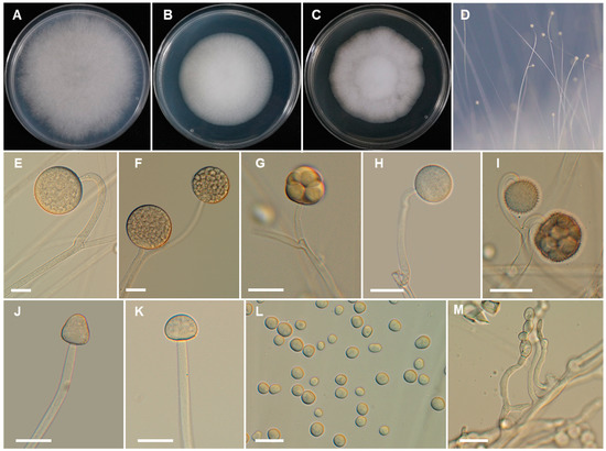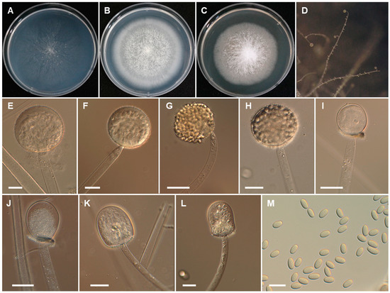 Morphology of Backusella chlamydospora. (A), Colony on SMA. B), Colony on PDA. (C), Colony on MEA. (D), Sporangiophores forming sporangia. (E,F), Sporangia. (G), Multi-spored sporangiolum. (H), Uni-spored sporangiolum. (I), Uni- and multi-spored sporangiola borne on circinate branches. (J,K), Columellae of different shapes. (L), Sporangiospores. (M), Chlamydospores. Scale bars = 20 μm.